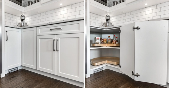 | سبد گردان (Lazy Susan) | طبقات گرد چرخان | نصب ساده، دسترسی آسان، مناسب ظروف سبک | عدم دسترسی کامل به فضای گوشه |