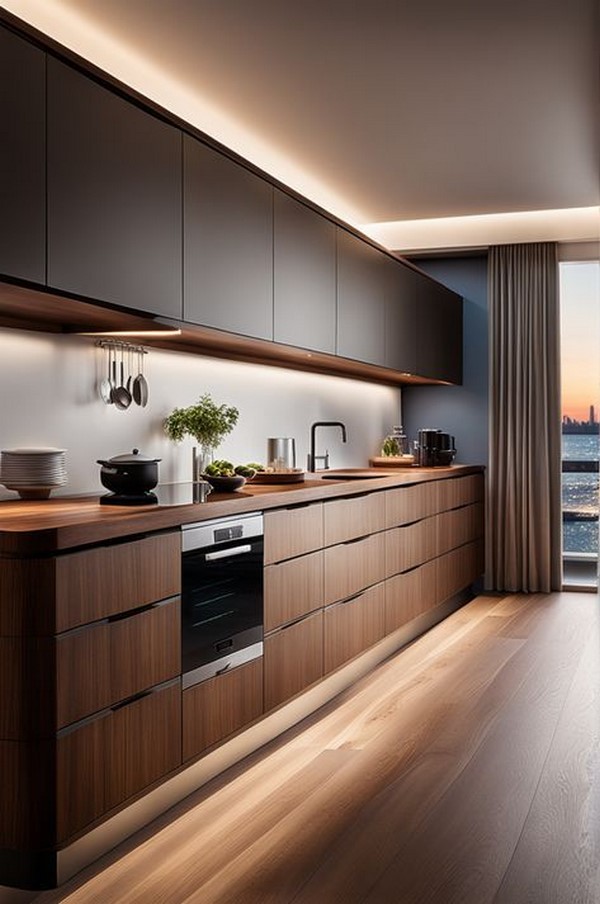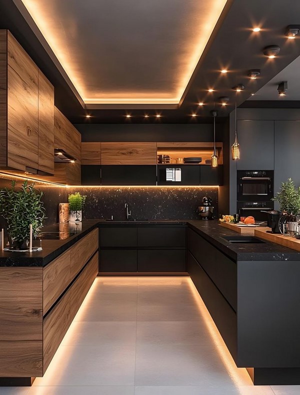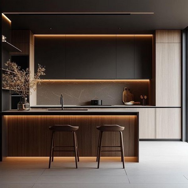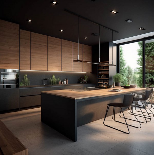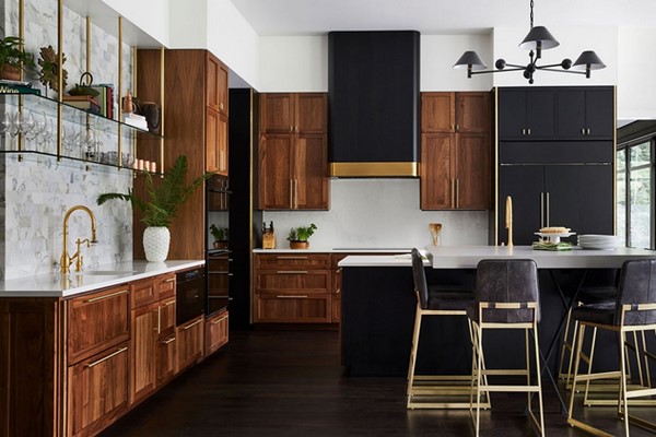 هماهنگی کابینت طرح چوب و مشکی با انواع دکوراسیون های مختلف