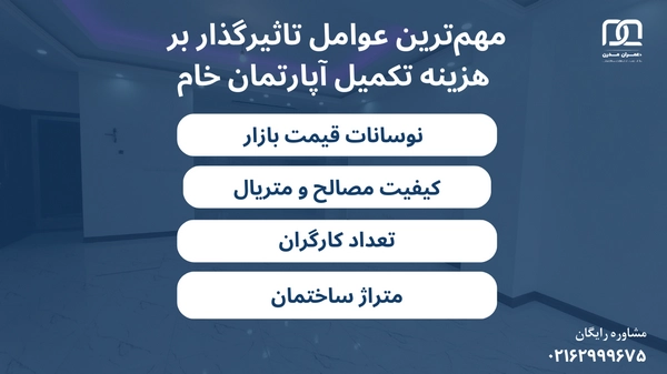 در برآورد هزینه تکمیل آپارتمان خام عوامل متعددی تاثیرگذارند که برخی از آنها عبارت است از: