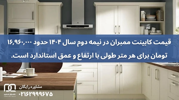 در سال ۱۴۰۴ قیمت کابینت ممبران در حدود متری ۱۶,۹۶۰,۰۰۰ تومان می باشد. در ادامه لیست قیمت کابینت ممبران بر اساس طرح آورده شده است. لازم به ذکر است که قیمت های زیر برای یک متر کابینت با عمق و ارتفاع استاندارد می باشد. همچنین در صورت اضافه شدن لوازم جانبی قیمت ها متفاوت می شود.