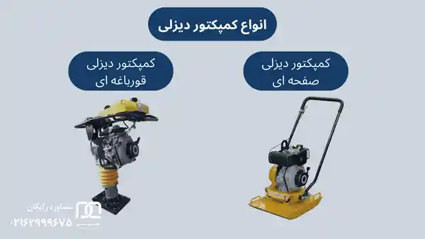 کمپکتور دیزلی در انواع صفحه ‌ای (دستی) و قورباغه ای (پرشی) تولید شده و به فروش می رسد. هر یک از این انواع، مزایا و کاربردهای خاص خود را دارند که در ادامه به آن ها اشاره می کنیم.