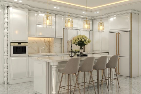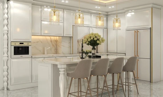 رنگ سفید یکی از پرطرفدارترین و کلاسیک ترین گزینه ها در انواع کابینت انزو است. این رنگ با انعکاس نور، فضای آشپزخانه را روشن تر می کند. سفید در کابینت های انزو قابلیت ترکیب آسان با رنگ های دیگر مانند طلایی، نقره ای یا چوبی را دارد.