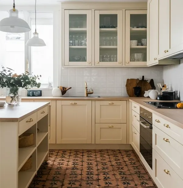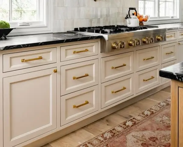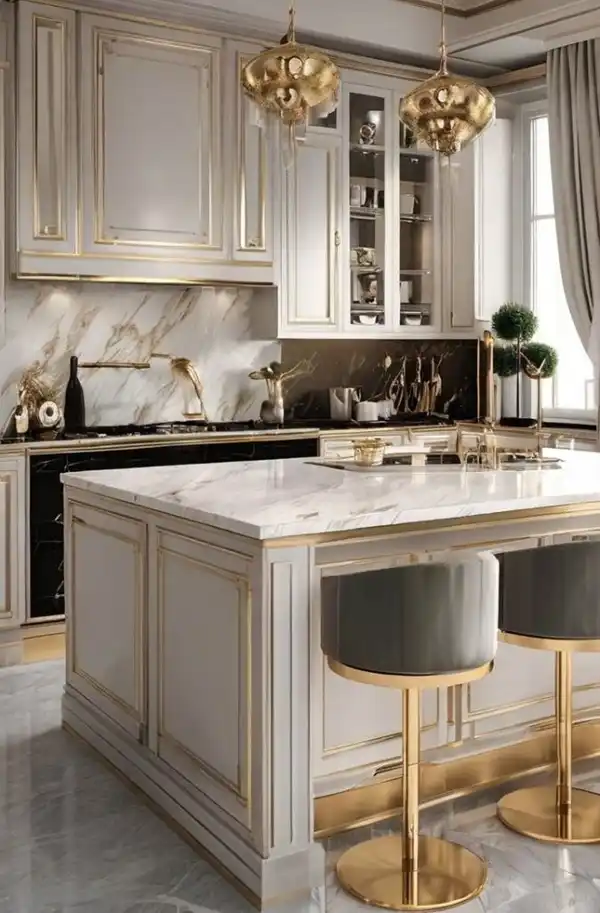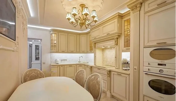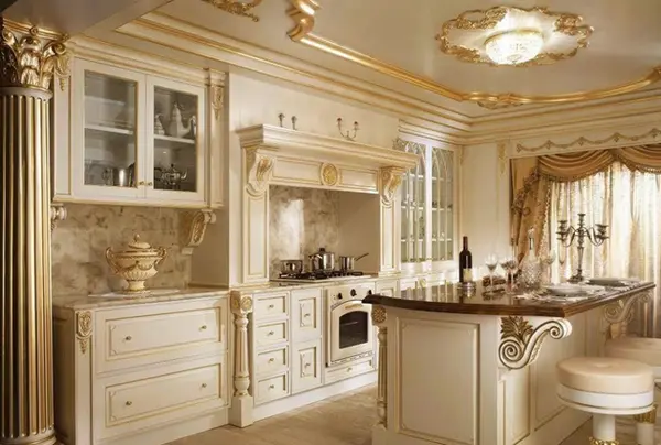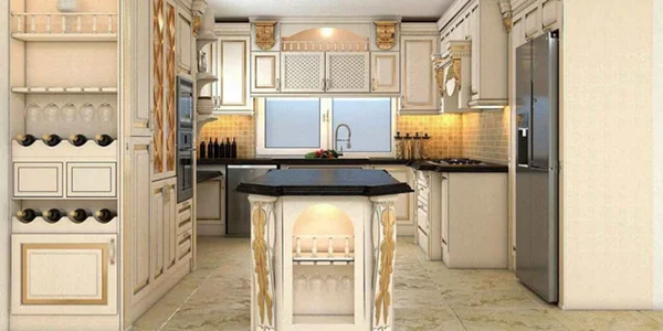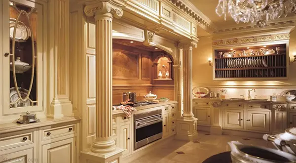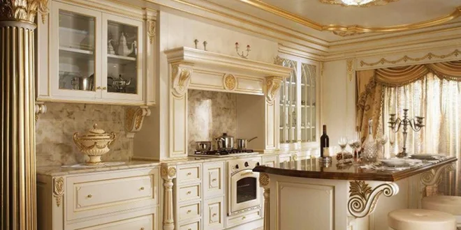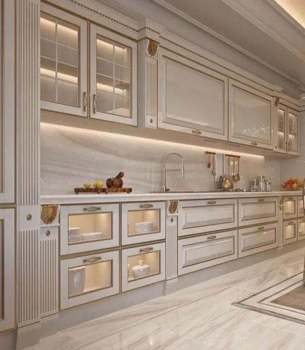 - کابینت ممبران صدفی و طلایی کلاسیک: کابینت ممبران کلاسیک صدفی و طلایی رنگ دارای جزئیات ظریف، حکاکی های برجسته و طرح های فاخر است. این سبک الهام گرفته از طراحی های سنتی بوده و از تاج، سرستون و دستگیره های آنتیک بهره می برد. کابینت های ممبران کلاسیک صدفی و طلایی برای آشپزخانه هایی با ابعاد و اندازه بزرگ تر مناسب بوده و فضایی مجلل و با شکوه ایجاد می کنند.