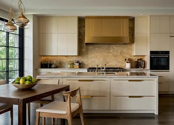 - کابینت ممبران صدفی و طلایی مدرن: این نوع از کابینت ها طراحی ساده، سطح صاف و خطوط مینیمال داشته و بیشتر بر کاربردی بودن، سادگی و استفاده از رنگ های خنثی تمرکز دارد. کابینت های ممبران صدفی طلایی مدرن گزینه بسیار مناسبی برای فضاهای امروزی و کوچک هستند.