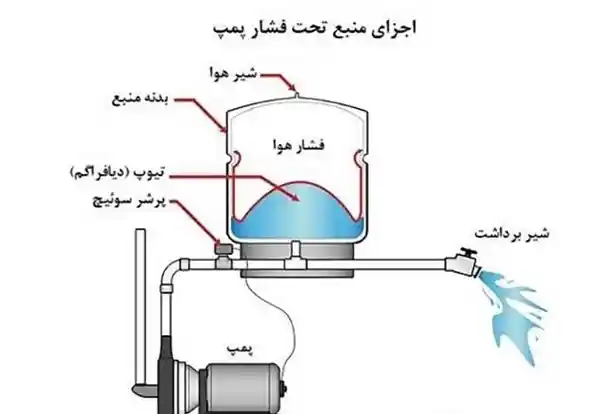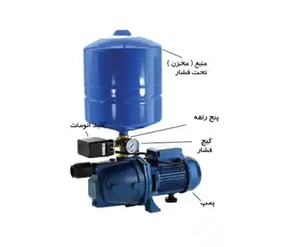 پمپ آب بخش اصلی است که وظیفه مکش و انتقال آب را بر عهده دارد. مخزن تحت فشار نیز همانطور که از نامش پیداست، یک مخزن است که آب را تحت فشار نگه می دارد و معمولاً دارای یک دیافراگم یا بالشتک هوا برای حفظ فشار است. یکی دیگر از اجزای پمپ و منبع آب ، سوئیچ فشار است. این دستگاه فشار داخل سیستم را کنترل کرده و پمپ را در زمان مناسب روشن یا خاموش می کند.