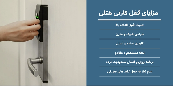 قفل کارتی هتلی یک از امن ترین و جدیدترین انواع قفل های هوشمند است که خیال مسافران و هتل داران را از لحاظ حفظ امنیت در هتل ها و اقامتگاه ها راحت کرده است. دستگیره هوشمند هتل عمدتا دارای سیستم ضد سرقت و ضد حریق بوده و در صورت بروز خطر به سرعت فعال می شود و هشدار می دهد. جنس بدنه و کیفیت ساخت قفل هتل کارتی بسیار مستحکم و ضد ضربه است و در مقایسه با قفل های کلیدی و قدیمی از امنیت فوق العاده بالایی برخوردار است. از این نوع قفل علاوه بر هتل ها، مسافرخانه ها و مهمانسراها، برای درب ادارات، واحدهای مسکونی و ویلاها استفاده می شود.