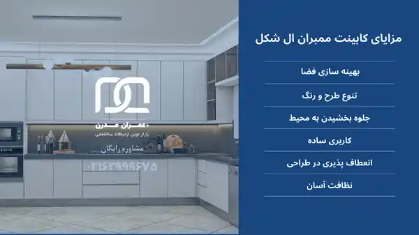 این نوع کابینت ها معمولاً شامل کابینت های گوشه ای هستند که فضای ذخیره سازی را افزایش می دهند. از دیگر ویژگی های کابینت ممبران ال شکل می توان به زیباتر شدن محیط و فضای آشپزخانه اشاره کرد. کابینت های ممبران به دلیل سطح صاف و بدون دستگیره شان، ظاهری مدرن و شیک به آشپزخانه می بخشند. این نوع کابینت ها از جنس MDF با روکش PVC ساخته می شوند که امکان تنوع در رنگ و طرح را فراهم می سازند.