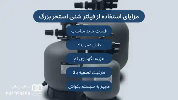 استفاده از فیلتر شنی استخر بزرگ امتیازات قابل توجهی به همراه دارد. نخستین مزیت، قابلیت اطمینان بالای این فیلتر است. فیلتر شنی به دلیل ساختار ساده و عدم نیاز به قطعات متحرک، از قابلیت اطمینان بالایی برخوردار است و نیاز به تعمیرات کمتری دارد. قیمت پایین و مقرون به صرفه مهم ترین مزیتی است که فیلتر شنی استخر بزرگ دارد و برای اغلب کاربران گزینه ای مهم به شمار می آید. هزینه اولیه و نگهداری فیلتر شنی نسبت به سایر سیستم های تصفیه مانند فیلتر دیاتومه یا فیلتر کارتریج پایین تر است. علاوه بر این موارد، فیلتر شنی قادر است حجم زیادی از آب را در مدت زمان کوتاهی تصفیه کند، که این ویژگی برای استخرهای بزرگ بسیار مهم است.
