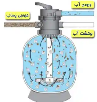 - شستشوی معکوس (Backwash): به طور منظم و با توجه به میزان استفاده از استخر، فیلتر شنی باید شستشوی معکوس شود. این فرآیند باعث می شود آلودگی های جمع شده در شن خارج شوند. مدت زمان شستشوی معکوس معمولاً بین ۳ تا ۵ دقیقه است.