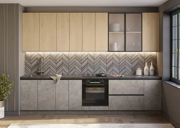 با وجود اینکه این مدل کاملا مات است و بازتاب نور ندارد، ولی می تواند در کنار عناصر پر جاذبه و براق قرار بگیرد و یک ترکیب جالب خلق کند. به عنوان مثال می توان از قاب های طرح دار، تاج های تزئینی و دستگیره های مجلل، در ترکیب با سطوح مات استفاده کرد. نورپردازی مخفی زیر کابینت های بالا نیز ظاهر آشپزخانه را رویایی می کند.