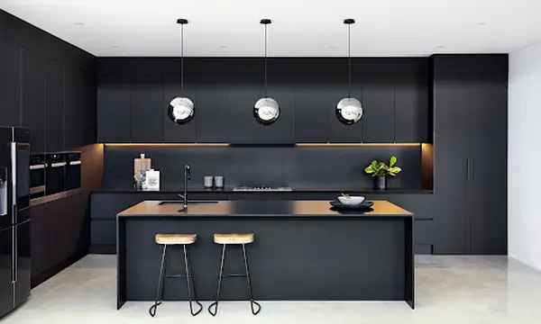 اگر به دنبال ایجاد فضایی مدرن و شیک هستید، رنگ های تیره مانند مشکی، طوسی تیره یا آبی نفتی هم برای کابینت های گلاس مات مناسب هستند. این رنگ ها نه تنها حس قدرت و امنیت را القا می کنند بلکه بسیار امروزی هم هستند.