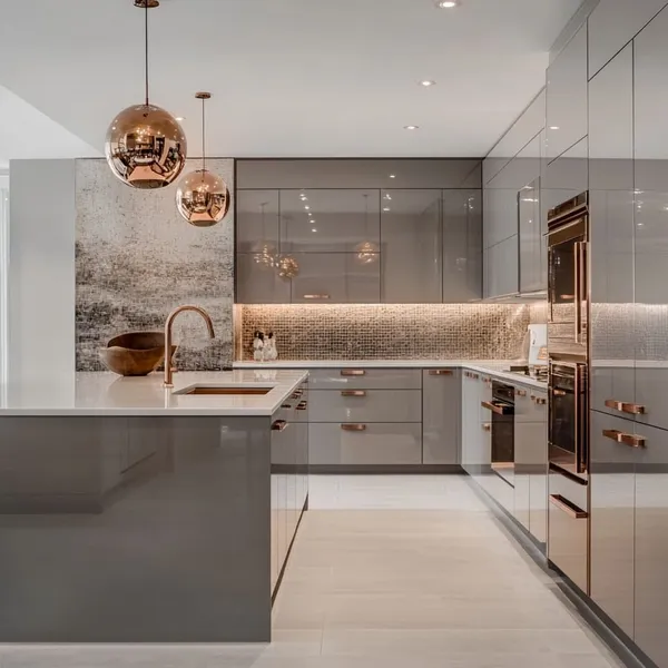 انتخاب رنگ های متالیک مانند نقره ای، طلایی یا مسی برای جزئیات و تزئینات کابینت ها می تواند جلوه ای لوکس و شیک به فضای کوچک بدهد. این رنگ ها باعث ایجاد درخشش و برجستگی در کابینت ممبران برای آشپزخانه کوچک می شوند.