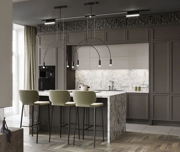 - برای تکمیل زیبایی سبک نئوکلاسیک، معمولاً از سنگ های طبیعی یا مصنوعی مانند مرمر و گرانیت برای روکابینتی و پیشخوان استفاده می شود که جلوه ای لوکس به آشپزخانه می بخشد.