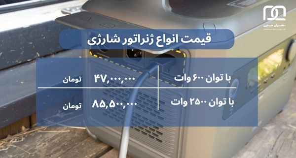 در نیم سال اول ۱۴۰۴ قیمت ژنراتور شارژی با توان ۶۰۰ وات ۴۷,۰۰۰,۰۰۰ تومان و با توان ۲۵۰۰ وات ۸۵,۵۰۰,۰۰۰ تومان می باشد. عوامل متعددی از جمله ظرفیت باتری، توان خروجی، برند و امکانات جانبی قیمت موتور برق باطری دار را تحت تاثیر قرار می دهند. هر چه ظرفیت باتری و توان خروجی بیشتر باشد، قیمت موتور برق شارژی افزایش می یابد. کارشناسان عمران مدرن همواره آماده پاسخگویی به پرسش های شما در خصوص خرید انواع تجهیزات ساختمانی و قیمت ژنراتور برق اضطراری می باشند.