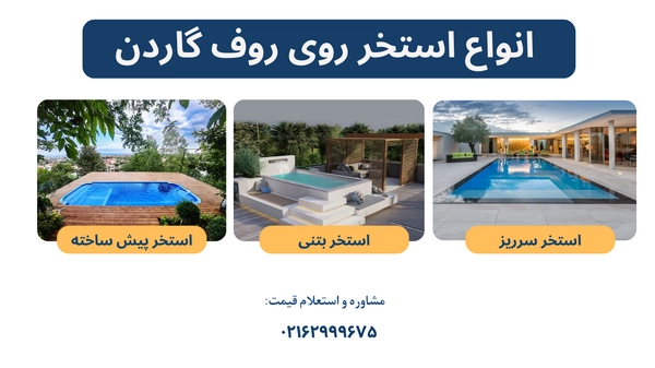 استخر بالای پشت بام به انواع مختلفی تقسیم می شوند که هرکدام ویژگی ها و کاربردهای خاص خود را دارند. برخی از انواع رایج استخر روف گاردن عبارتند از: