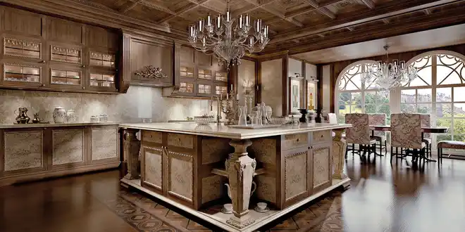 از کابینت ساز مشورت بگیرید که چه نوع کفپوش، کاشی بین کابینتی، دیوارپوش و لوستر با سبک کابینت سلطنتی رومی هماهنگ است.