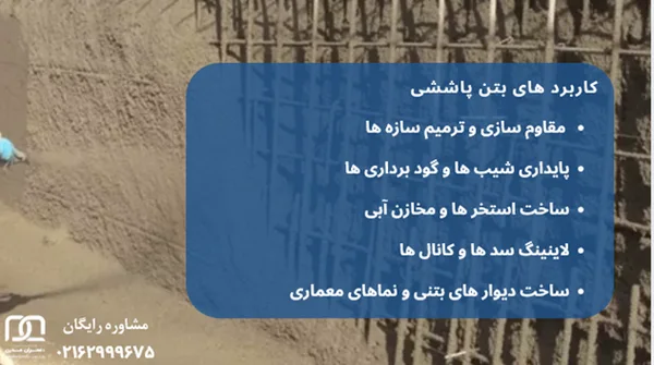 - در انواع پروژه های عمرانی مختلف برای جلوگیری از ریزش خاک و تثبیت دیواره های حفاری شده از بتن پاششی استفاده می شود.