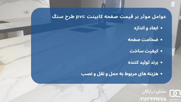 قیمت صفحه کابینت pvc طرح سنگ به عوامل مختلف و بسیار زیادی بستگی دارد. به همین دلیل نمی توان یک عدد مشخص و معین را برای صفحه کابینت پی وی سی طرح سنگ در تمامی آشپزخانه ها تعیین کرد. اما به طور کلی قیمت این محصول در نیمه دوم سال ۱۴۰۴ برای یک صفحه با ابعاد ۴۰۰x۶۰x۵ حداقل ۳,۰۰۰,۰۰۰ تومان است. برخی از مهم ترین عوامل تاثیر گذار در قیمت صفحه کابینت پی وی سی طرح سنگ عبارت اند از: