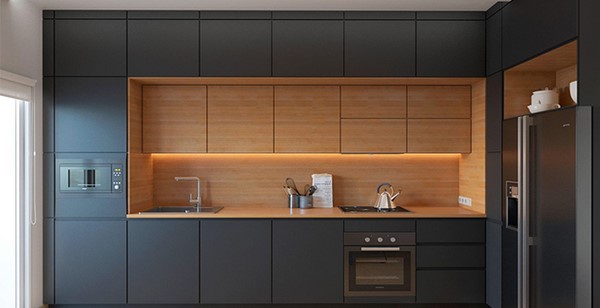 - مشکی و چوبی: کابینت دو رنگ های گلاس مشکی و چوب انتخابی لوکس و متفاوت برای آشپزخانه های مدرن است که با تأکید بر تضاد رنگی، زیبایی و جذابیت خاصی به محیط می بخشد.