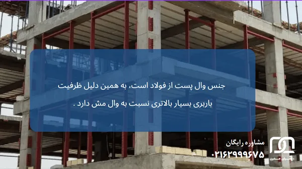 - جنس وال پست از فولاد است، به همین دلیل ظرفیت باربری بسیار بالاتری نسبت به وال مش دارد.