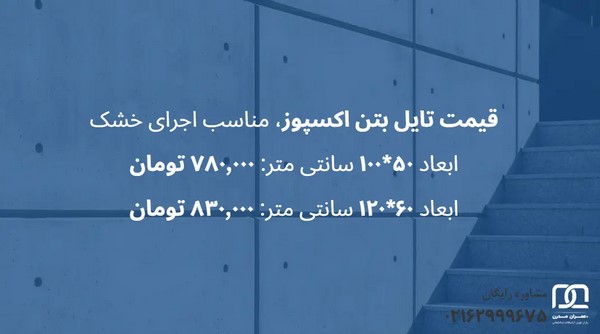 قیمت تایل بتن اکسپوز با ابعاد ۵۰*۱۰۰ سانتی متر و به روش نصب خشک به ازای یک متر مربع معمولاً حدود ۷۸۰,۰۰۰ تومان است، در حالی که قیمت هر متر مربع تایل با ابعاد ۶۰*۱۲۰ سانتی متر در روش نصب خشک به ۸۳۰,۰۰۰ تومان می رسد.