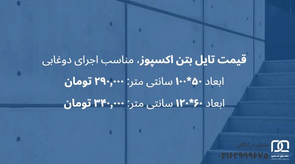 قیمت تایل بتن اکسپوز نصب دوغابی با ابعاد ۵۰*۱۰۰ سانتی متر به ازای یک متر مربع حدود ۲۹۰,۰۰۰ تومان است، در حالی که قیمت تایل بتن اکسپوز با ابعاد ۶۰*۱۲۰ سانتی متر در روش نصب دوغابی حدود ۳۴۰,۰۰۰ تومان به ازای یک متر مربع می باشد. این تفاوت قیمت به دلیل ابعاد مختلف تایل ها است؛ هرچه ابعاد تایل بزرگ تر باشد، بتن اکسپوز داخلی قیمت بیشتری خواهد داشت.